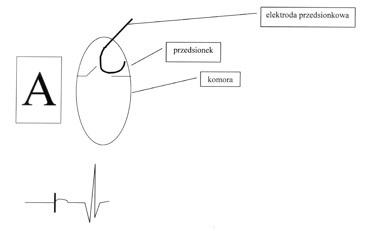 Ryc. 2 . Układ z jedną elektrodą przedsionkową – pierwsza litera kodu: A. Schematyczny zapis EKG stymulacji elektrodą elektrody przedsionkową.