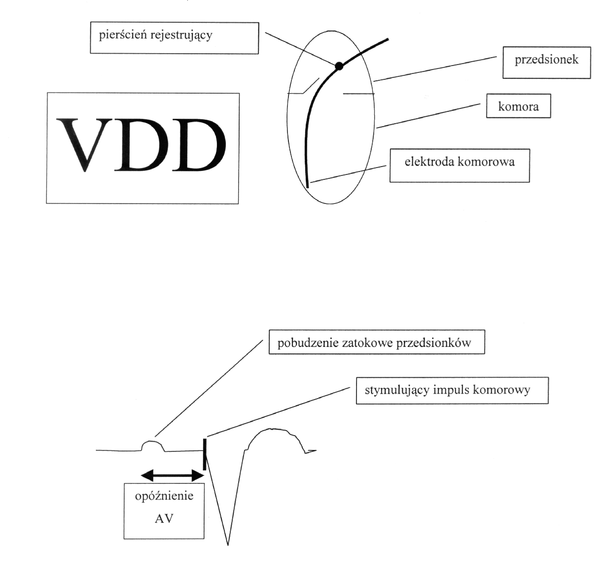 Układ stymulujący DDD posiada zdolność rejestrowania potencjałów, oraz stymulacji zarówno w przedsionku, jak i w komorze (ryc. 3). U chorych z prawidłową funkcją węzła zatokowego, u których nie zachodzi potrzeba stymulacji przedsionkowej, układ ten zachowuje się dokładnie tak, jak opisany powyżej układ VDD, pracujący w trybie VAT (ryc. 5). Jeżeli natomiast u chorego występuje nadmierna bradykardia zatokowa, powodująca zwolnienie częstości rytmu przedsionków poniżej zaprogramowanej częstości podstawowej, system podejmuje stymulację przedsionkową. W przypadku gdy bradykardii zatokowej nie towarzyszy upośledzenie przewodzenia przedsionkowo – komorowego, system pracuje w opisanym powyżej trybie AAI (ryc. 2). Przy współistnieniu zaś dysfunkcji węzła zatokowego i przewodzenia przedsionkowo – komorowego system podejmuje sekwencyjną stymulację przedsionka i komory.